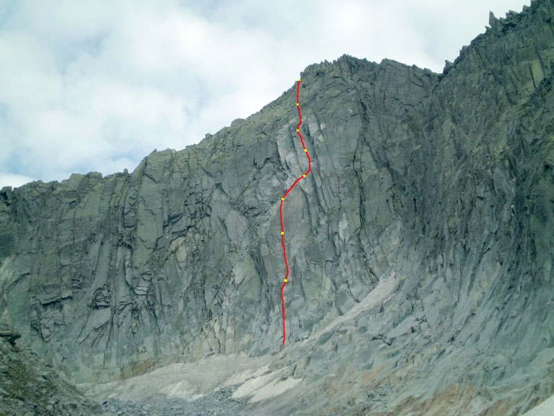 Fessure Remote: Tracciato di Fessure Remote (280m, VII obl. e 20m di A1 continuo) parete Ovest della Cima di Danerba 2.910m (Catena del Breguzzo, Gruppo Adamello)