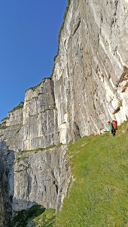1. a piedi per il sentiero SAT 602 fino alla Malga di Fai 1665m 1.30h, poi proseguire ancora per 5 minuti a sx fino alla evidente forcella dove appare la parete, scendere il ripido canale e quasi in fondo, dove c’è un masso con un albero di acero, attraversare orizzontalmente a dx per roccette II°, poi risalire brevemente all’evidente grotta dell’attacco. Dal Santel in circa 1.45 ore, dalla Malga di Fai in 20 min.