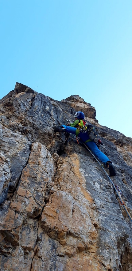 L1: 30m su placche articolate in verticale 3ch di passaggio + 1cl. Sosta sul margine dx di un terrazzo detritico. Sosta 1ch e 1spit-anello con cordone IV V+ VI-
