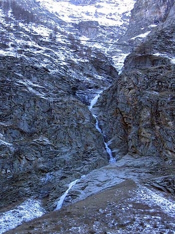 Proseguire per la strada sino al terzo tunnel paravalanghe,posteggiare l'auto lungo la strada. Sulla sx orografica è ben visibile la cascata. Da qui due opzioni: o attraversare il torrente e puntare verso l'itinerario in questione oppure proseguire in auto sino al villaggio di Bois de Clins, parcheggiare e seguire la strada sterrata che costeggia il torrente sino a reperire i pendii che accedono la cascata. (20'/ 30'minuti) Discesa