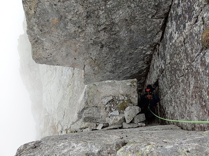 In loco 8 fix alle soste, 1 chiodo di passaggio e qualche cordone su sassi incastrati. Portare una serie di friends al #3, stoppers, qualche microfriens e qualche chiodo assortito.