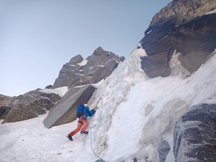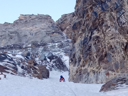 L1: Salire lo stretto canale di neve per 55 metri. Sosta a destra, fix e maillon