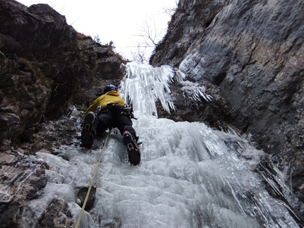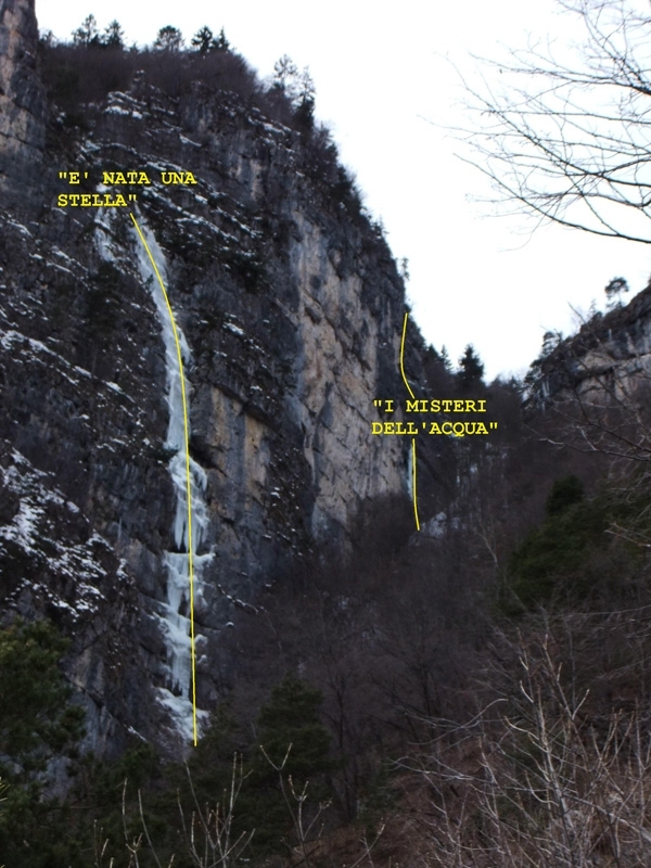 L1: salire il violento candelotto sbucando su una bella cengia, fare sosta sull'albero con cordone a sx. 40m M4+.