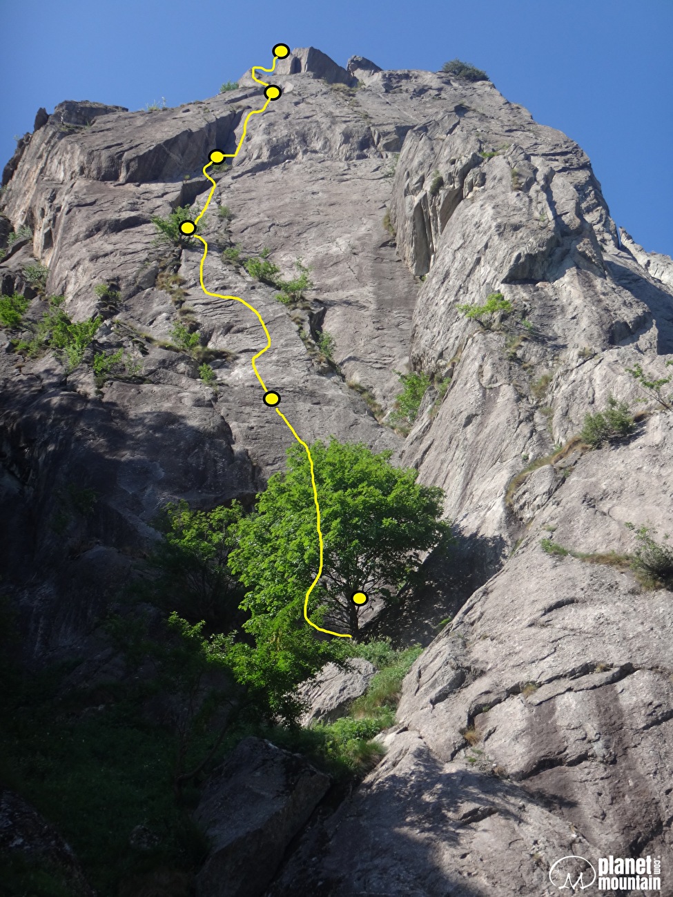 L5: 6b+, 45m. Superare lo strapiombino in comune poi raggiungere a sinistra il pilastro verticale che presenta un passo di decisione ben protetto (fix alto) per poi guadagnare, sempre dritti, la sua sommità e quindi l’affilato facile spigolo e placchetta che conducono in vetta.