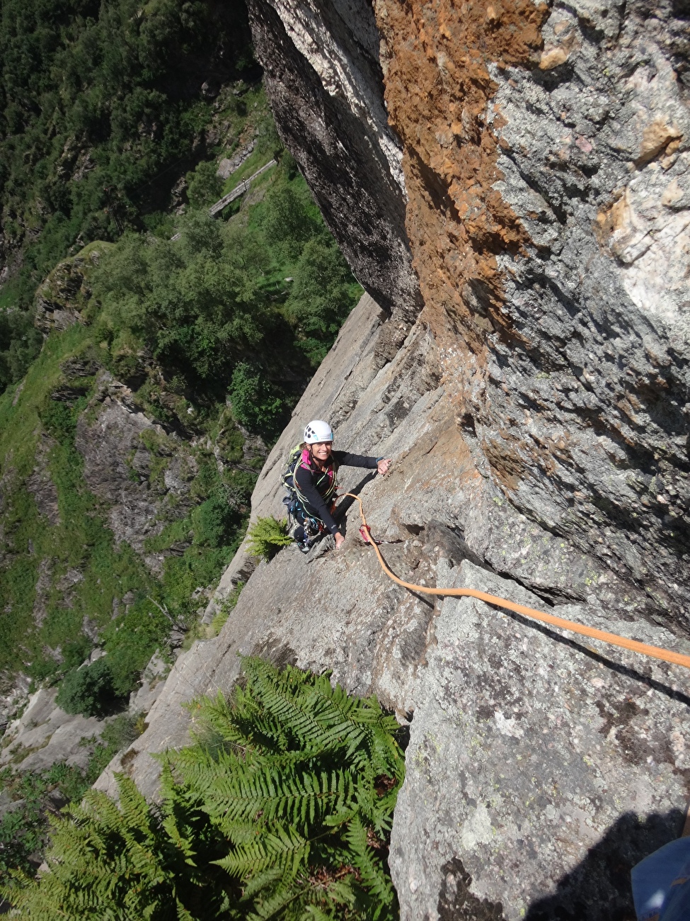 Uscita in fessura sul terzo tiro di 'Il Gatto e la Volpe', Pinnacolo di Maslana, Valbondione (Cristina Oldrati, Matteo Rivadossi, 29/06/2025)
