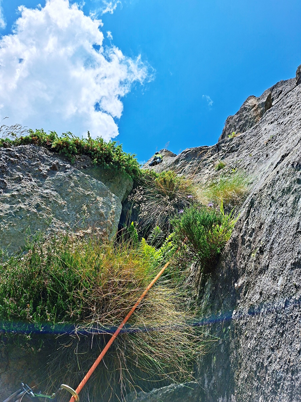In apertura sul pilastro del quinto tiro di 'Il Gatto e la Volpe', Pinnacolo di Maslana, Valbondione (Cristina Oldrati, Matteo Rivadossi, 29/06/2025)
