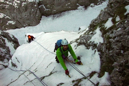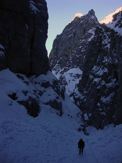 L6: dritti 150m canale 35/55°, quindi in diagonale a sinistra per altri 200m (30/40°) fino alla Carozza.