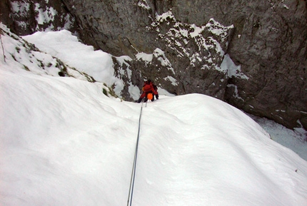 L4: traversare 30m 55°, quindi superata una costola, ancora in traverso in salita (20m 60°) fino ad una fascia rocciosa (sosta 2ch)