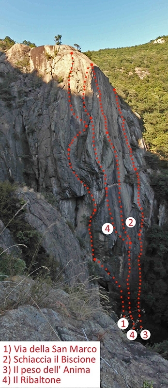 Alzarsi nel diedro (Via delle Fattucchiere) per andare a prendere il filo dello spigolo che lo delimita a destra. Con un breve passo in leggero strapiombo prendere la placca soprastante e seguirla sino in sosta. S2 5a.