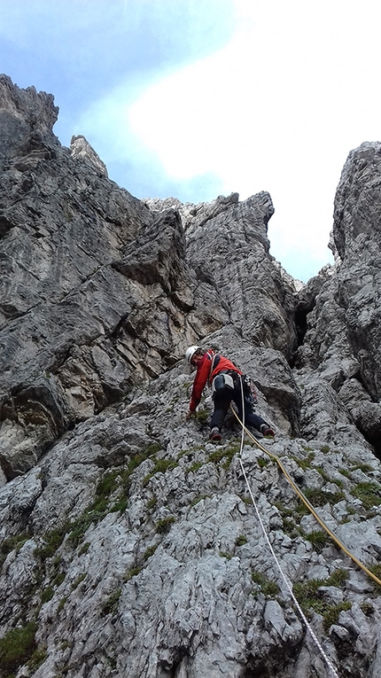 L3: Si traversa verso dx fino ad entrare nel canale. Giunti ad un ometto si sale verso sx fino alla sosta (fix+ch). III, 35m