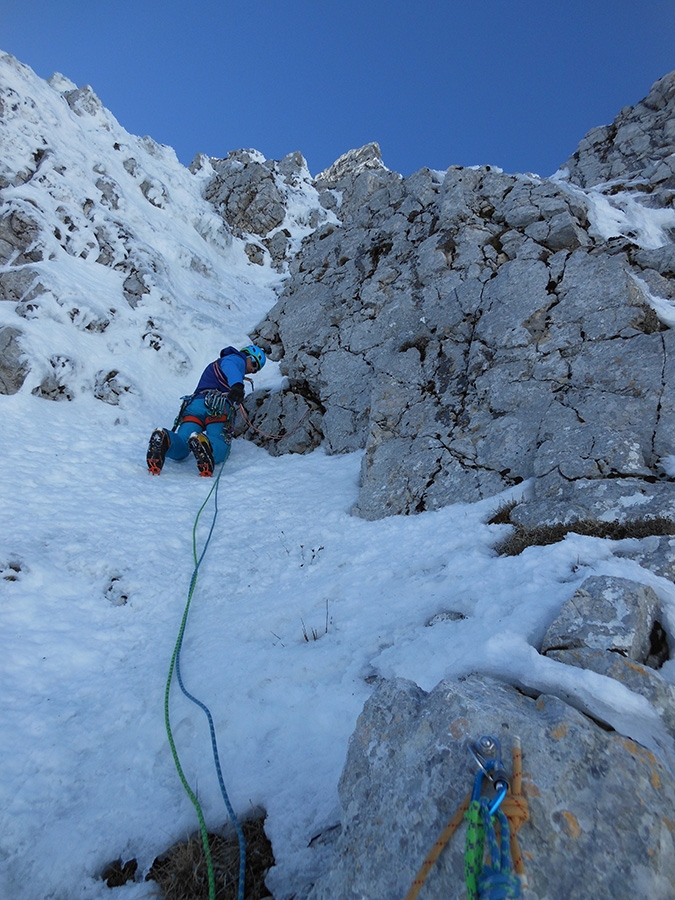 L2 (20 m, 50° con un tratto a 75°) Tiro sostanzialmente di trasferimento se si eccettua un piccolo pezzo appena a monte della S1 (75°); superato questo si perviene ad un tratto appoggiato con neve. Lo si attraversa in deciso obliquo verso dx per raggiungere la sosta posta sulle pareti rocciose, alla base di una goulotte delimitata da un diedro sulla dx.
