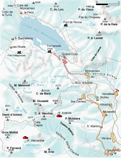 A piedi si attraversa Ferrera Cenisio (1461 m), con le sue grandi dimore raggruppate sulla sponda destra del torrente Cenischia. Superata la chiesa, le ultime case e il cimitero, si imbocca l’evidente mulattiera (in estate se ne può scorgere il selciato), a tratti fiancheggiata da muretti a secco. Si prosegue lungo il tracciato dell’antica via che si alza fra radure, mantenendosi sul fianco destro idrografico della valle, sempre in direzione ovest. Si piega a sinistra (sud) e si esce sulla statale 25, che si segue in salita (destra), raggiungendo presto la frontiera. Superata la strettoia del Pas du Paradis si entra nella Piana di San Nicolao, incontrando subito un bacino artificiale. Si cammina sulla strada fino al fondo del pianoro, si oltrepassano i caseggiati degli impianti idroelettrici (1728 m), e sui tornanti si supera il risalto delle Scale del Moncenisio, caratterizzato sulla destra da belle cascate di ghiaccio. Usciti sulle praterie innevate soprastanti, presso un grande, spettrale edificio, si devia a sinistra per raggiungere in breve il villaggio di Grand-Croix, abbandonato dopo la costruzione della grande diga del Lago del Moncenisio. Attraversato il paese fatiscente (la chiesetta ospita un museo aperto d’estate), si prosegue in direzione nord ovest per radure aperte. Poco dopo si gira a sinistra, si supera un ponticello e si segue la pista sterrata che passa presso un edificio degli impianti idroelettrici; con un tornante e un traverso la pista risale al margine destro (ovest) della diga. Qui si trascura la strada che porta sul coronamento della diga, e quella che va in direzione opposta, per salire verso la casa di sorveglianza. Con qualche tornante si sale così all’Ancien Fort de Variselle (2106 m), posto su un cocuzzolo che offre un bel panorama sul Lago del Moncenisio e sulle montagne circostanti.