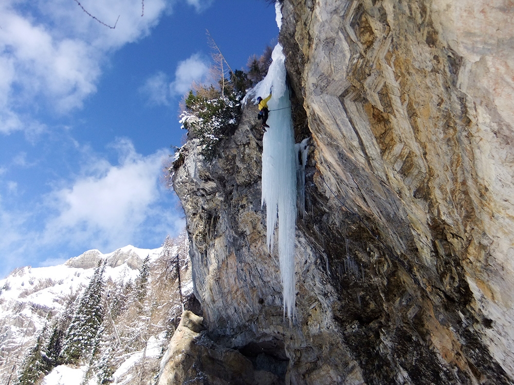 Materiale per una ripetizione: qualche vite da ghiaccio, 5 rinvii, consigliate corda singola da 60 m (con cordino di rappello per le doppie) e scarpette da dry. Note