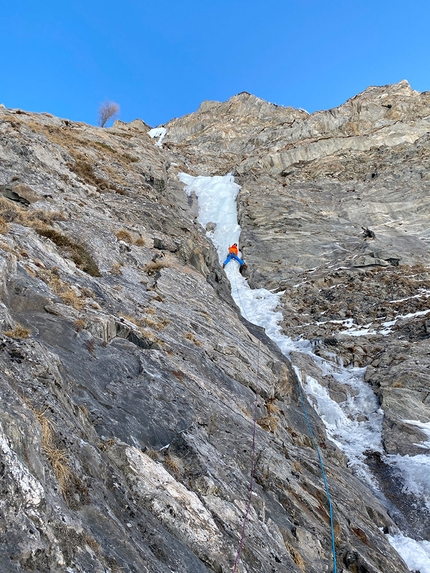 Linea di ghiaccio e misto in ambiente solitario e isolato ma non eccessivamente lontano dall'auto. Le difficoltà non sono elevate ma è comunque richiesto un pizzico di spirito di avventura considerando che in posto non si trova materiale ad eccezione dell'ultima sosta.