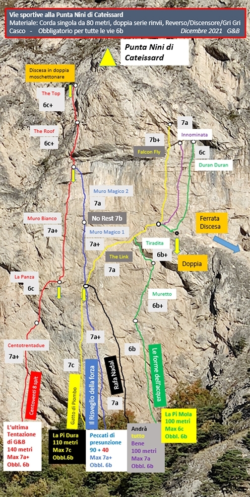 Tutte le vie partono dalla falesia Profondo Rosso di Cateissard e sono frutto di più combinazioni anche di preesistenti monotiri con gradi dal 6b al 7c.