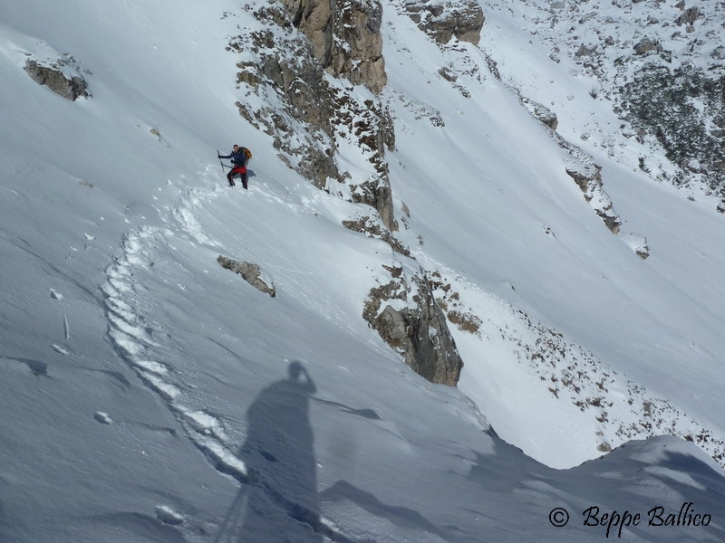 La Piera: Beppe Ballico nella cengia di avvicinamento verso La Piera, Vallunga, Dolomiti