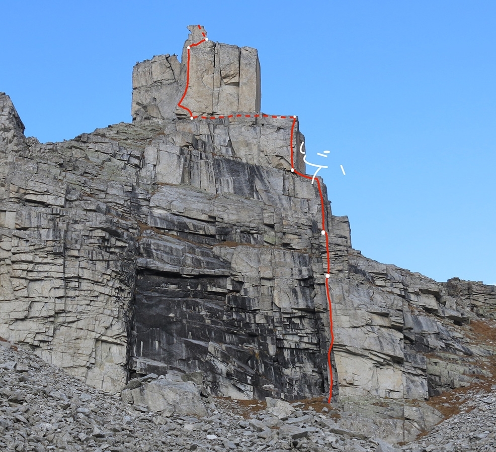 L1: 20m 6b+. Si parte da un diedrino appena a sx dello spigolo, traversando sotto a un piccolo tetto si prende e segue lo spigolo. 3fix. sul tiro, 1 fix in sosta.