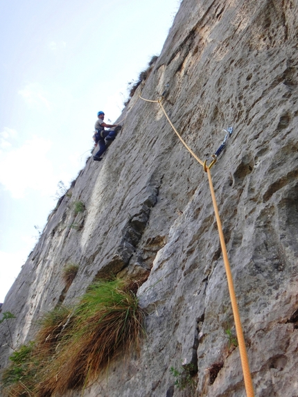 L3: 6a+, 20m. Alzandosi verticalmente sopra la sosta, traverso delicato orizzontale a dx poi per aleatoria rampa obliqua fino alla sosta in comune con Carmina Burana.