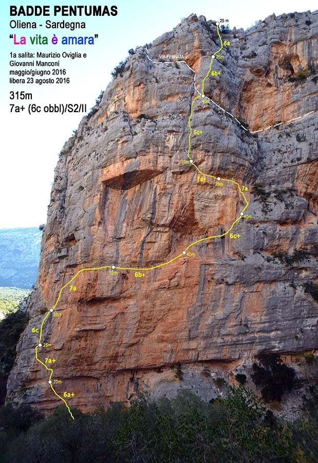Sul lato estremo sinistro della parete, sul grigio, c’è la via Casadinas di Nadali & c. Venti metri più a destra, all’inizio degli strapiombi parte invece “La vita è Amara”, nome scritto sulla roccia. Altri venti metri a destra parte invece Unchìnos. Discesa