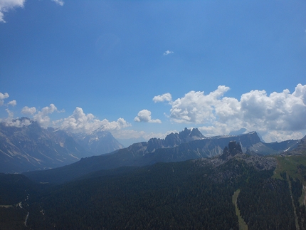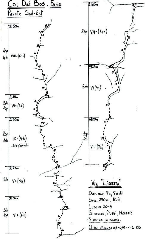 Bella via che supera i tratti gialli nel centro della parete sud-est del Col dei Bos, a sinistra della via Francesa di Paolo Da Pozzo e Giuseppe Ghedina.