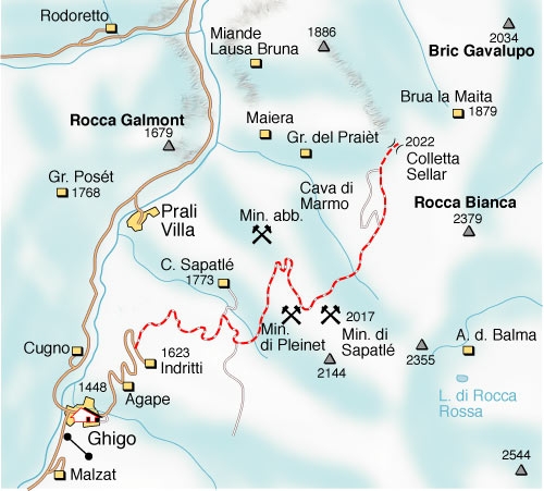 Miniere di Sapatlé e Colletta Sellar 2022 m, da Prali Ghigo