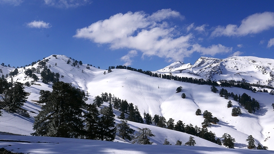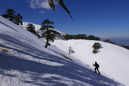 Con abbondante innevamento si può partire direttamente dal paese di Samarina (1400 m). In questo caso al dislivello complessivo vanno aggiunti altri 400 m. Se questo il caso, individuare il campo da calcio e seguire la traccia segnata che sale fra le cime del Bogdani e del Tsekouras. In alternativa, con un innevamento meno abbondante o a stagione inoltrata, seguire la strada che dal paese di Samarina asfaltata sale verso Nord-Ovest. Giunti poco prima di un valico, sulla destra c’è uno slargo dove è possibile parcheggiare. Lasciata l’auto, si sale per dolci pendii in direzione Sud-Ovest. Si attraversa una stupenda foresta di querce e Pini loricati e giunti a quota 2054 si continua a seguire la larga cresta ornata di alberi monumentali fin sotto il versante Est del Bogdani. Per pendii facili si giunge quindi sulla vetta del Mikri Mosia (2554m). Da qui, messi gli sci sullo zaino si segue la cresta rocciosa ed esposta fino a giungere a una piccola sella (tratto evitabile passando più in basso con un largo giro). Rimessi gli sci, si salgono i pendii del Megali Mosia (2554m) e si punta poi alla larga dorsale che conduce facilmente in vetta del Lemos (2600m). Un panorama incredibile si apre a 360 gradi: di fronte la vetta dello Smolikas, a Ovest il Gamila e il massiccio dell’Olympo a Sud-Est. Discesa