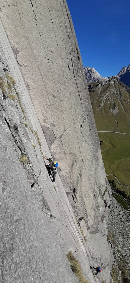 Mozzarellissima è una via bella e severa, richiede a tratti un po’ di sangue freddo ed esperienza nell’utilizzo di protezioni veloci ma ripaga abbondantemente in soddisfazione a patto di padroneggiare il grado. Risale la grande lavagna di sinistra su una delle ultime porzioni non attrezzate del corpo principale della parete e trova una soluzione d’uscita tra i tetti e gli strapiombi della repulsiva e poco esplorata sezione sommitale. Dal quarto tiro la roccia è costantemente ottima e l’arrampicata si fa sostenuta nei gradi e nella continuità. Il sesto tiro è un’entusiasmante avventura di arrampicata molto varia e da interpretare!