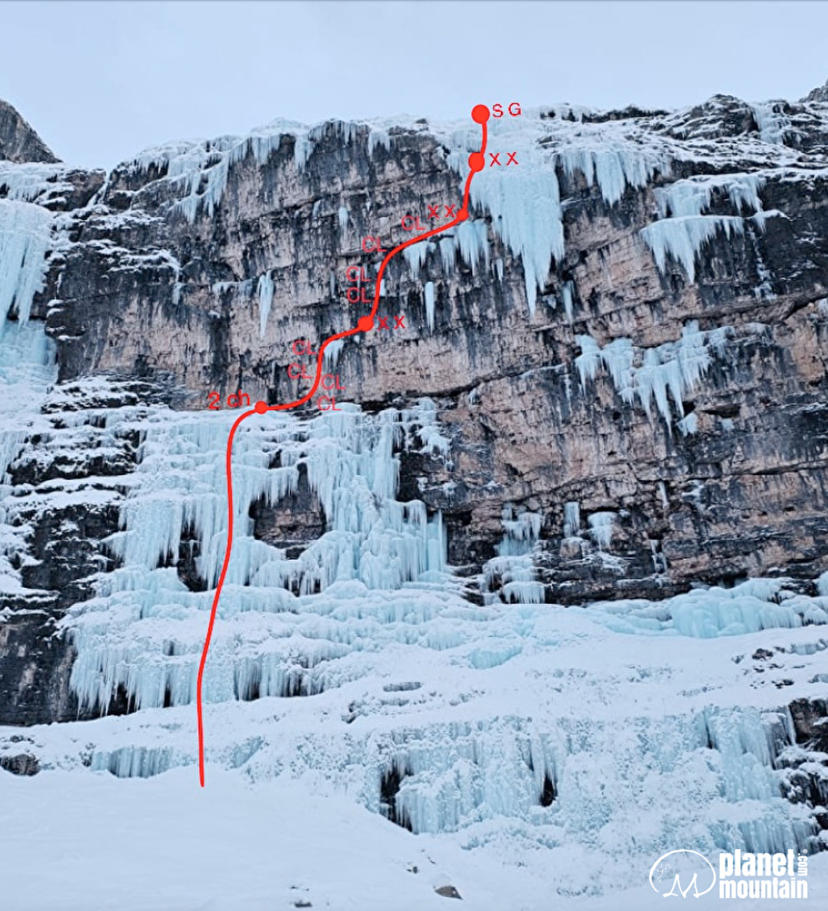 L3: salire dritti dalla sosta quindi traversare a destra su ghiaccio e qualche passo di misto. M6+, 20m, sosta 2 fix