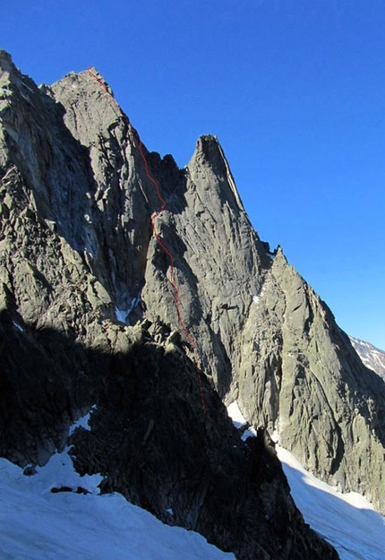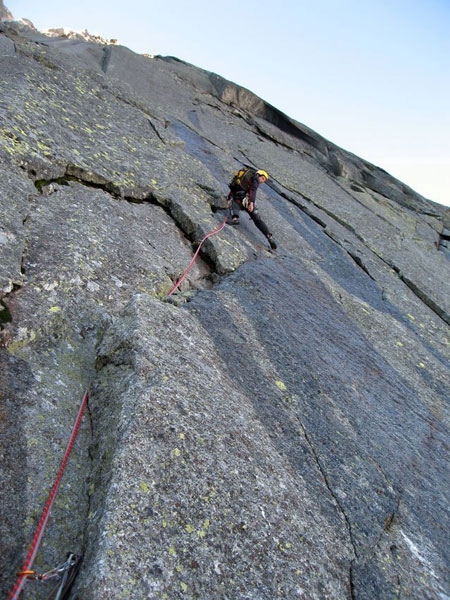 Lungo itinerario che si articola su placche di ottimo granito. L'arrampicata è sostanzialmente delicata ed esterna. L'impegno generale è dato soprattutto dal fatto che si trova pochissimo materiale in posto ed è necessario proteggersi con protezioni veloci di ogni dimensione (anche per le soste).