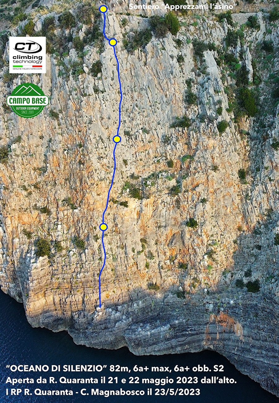 Si tratta di un itinerario totalmente attrezzato a fix, su roccia da buona ad ottima, il primo in assoluto aperto su questa porzione di costa che va da Acquafredda (frazione di Maratea) a Sapri. L’esposizione è SO, partendo la mattina presto è possibile percorrerlo anche d’estate, oppure nel tardo pomeriggio, godendo sempre di uno spettacolare scenario sul mare. Per ripetere la via bisogna prima effettuare 4 calate in corda doppia per raggiungere la base e poi risalire i tiri in arrampicata.