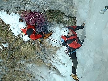 Cascata frequentata e adatta per l'iniziazione al ghiaccio verticale. Si èarte su placca appoggiata per poi affrontare una candela a sinistra. Salita la colonna si attraversa decisamente a destra per sostare su roccie. Con l'ultima lunghezza ci si incunea fra...