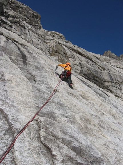 Bell' itinerario in ambiente su un granito ricco di knobs. La chiodatura è da integrare e talvolta senza essere pericolosa è abbastanza lunga.