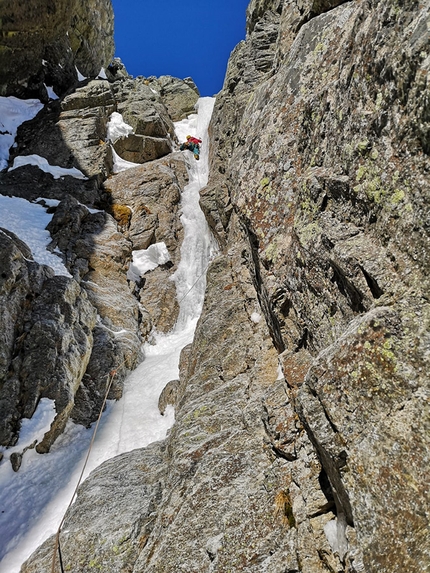 Parete Est - Piz Buin: Tito Arosio nel couloir iniziale durante la prima della nuova via con Rosa Morotti il 31/03/2019)