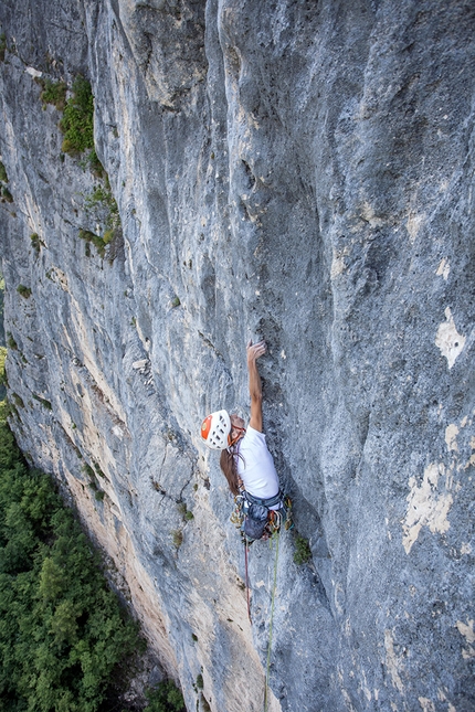 Roccia compatta e molto bella, adesso, visto che il “poco” di friabile è finito in fondo al bosco… Aperta dal basso con l’uso di fix inox 10 mm e qualche chiodo. Difficoltà massima 8a, difficoltà obbligatoria 7a.