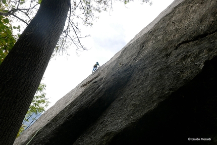 L2: V+, V - 80m Salire sulla vena bianca sovrastante con un difficile ristabilimento e traversare verso destra per una quarantina di metri in leggera discesa nel finale; da qui salire in verticale seguendo una serie di ondulazioni ben appigliate fino ad una fessura (possibilità di proteggersi) che va a chiudersi subito. Sempre su ondulazioni e breve placca si arriva su un terrazzo erboso. Sosta su alberello. Ora e solo ora, si inizia ad avere la consapevolezza di aver salito una delle vie melliche più leggendarie.