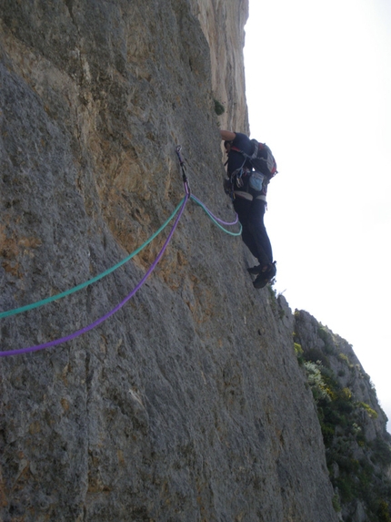 In doppia lungo la via saltando la sosta del terzo tiro. Materiale