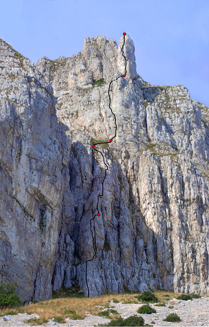 L5: attaccare la fessura a dx della placca con chiodo a 1m dalla sosta (3m, passo VI), quindi per più facile diedro fino a un forcellino a dx con fix appena a monte. Con un netto traverso a sx (2m, VII) , protetto con friend verde la fessura sfasa, si prosegue ancora più a sx ad una presa svasa alla fessura successiva, con passo molto delicato (VIII) si guadagna il piccolo pulpito per il piede tra le due fessure(ch); ora un ultimo passo duro (VI) e si esce su fessura più appoggiata e aperta che conduce in breve alla sosta di vetta; 22m