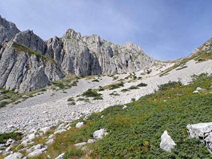 In breve si incontrano alberi piegati dalle valanghe (tracce) e in rapida salita si esce fuori dal bosco (q. 1770m circa; 1h20’), in vista dell’enorme ghiaione della Neviera e dei vari speroni che ci sovrastano. Il Peschio dello Scurribile è quello di destra, immediatamente a destra dell’inconfondibile struttura trapezoidale dalla cima piatta dell’Altare della Neviera (2207m). Si sale per scomodo ghiaione fino a toccare la base dello Sperone suddetto (1885m) per poi piegare a dx sfruttando le toppe erbose fino alla base dell’evidente torre Prignano; 1h45’.