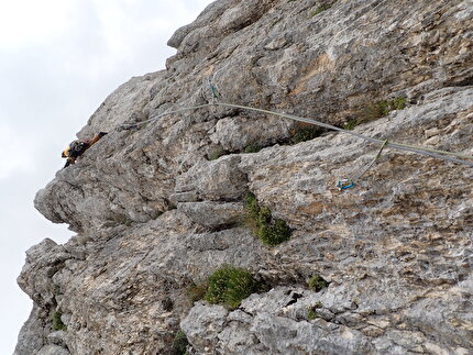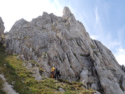 L2: Si attacca dritti il pilastro (6m, IV+, ch) fino a un ripiano, ora si traversa a dx a riprendere il filo del pilastro principale (IV+) ad attaccare un vago diedrino-pilastrino (V+, fix) che permette di vincere la parete verticale del pilastro. Ora per rocce più facili e via via più rotte (IV-, poi III) fino alle prime toppe erbose dove si traversa decisamente a sx per 4m alla sosta su due fix e a fianco l’anello di calata; 33m