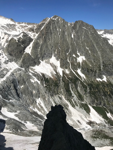 L7: 50m 3 Ci si porta alla base di un risalto scuro più ripido, sostare su blocco/spuntone L8 45m 4+ Non prendere direttamente lo spigolo (zona verticale/strapiombante) ma deviare a sx fino a un terrazzino con ch, seguire per un diedrino nero (chiodo in alto) e proseguire a una spalla con 2 ch. Il tiro più bello. L9 45m 3 Prendere la cresta fino a un tratto piano