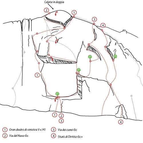 Dall’ ultima sosta spostarsi verso sx (faccia a monte) e, tenendosi vicini al bordo della parete, reperire una catena, prima doppia. Calarsi verticalmente sino ad una nicchia (sosta con catena). Da qui calarsi sino alla sosta alla base del diedro della via del Naso. Da questa sosta si arriva, con una doppia spettacolare sotto il grande tetto (prusik utile), a una cengia con albero. Ancora una breve doppia (circa 20m) riporta alla base. Le quattro doppie, a parte la seconda, sono sulla Via del Naso. Materiale