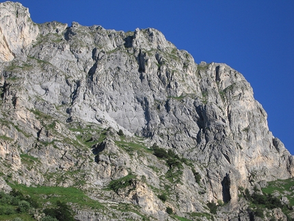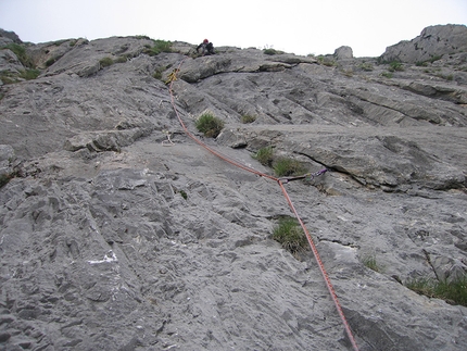 Trasferimento: risalire il cengione (gerbidi, 3 spit su rocce affioranti) in direzione dell'evidente placconata con diedro iniziale ad "orecchio", 120m, fix 3