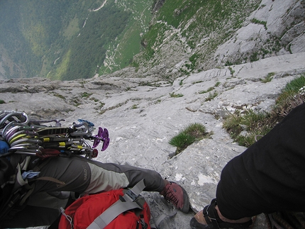 L13: prima roccette poi erba e mughi fino alla sosta S13 (1 fix + friend) si esce a destra sul prato sommitale a 30 metri dalla grande croce di ferro quota 2.150, 40m, 3, fix 1 Discesa