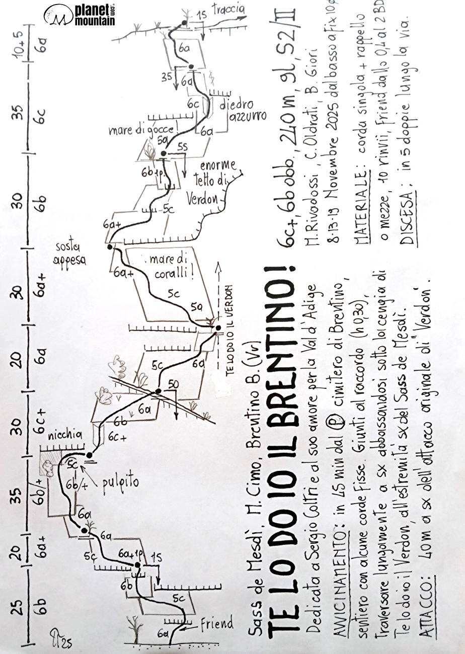 Spettacolare multipich sportiva al Sass de Mesdì del Monte Cimo, aperta dal basso, che serpeggia a traversi sulla discontinua parete appena a sinistra dell’iconica Te lo do io il Verdon, alla ricerca della continuità e della qualità dell’arrampicata. Roccia da antologia con concrezioni, canne, buchi, gocce e coralli. La location e le difficoltà accessibili (ma con ingaggio ed esposizione da non sottovalutare) ne fanno un itinerario destinato a diventare una classica del settore. Dedicata dagli apritori al mitico Sergio Coltri per il suo straordinario contributo all’arrampicata in Val d’Adige.