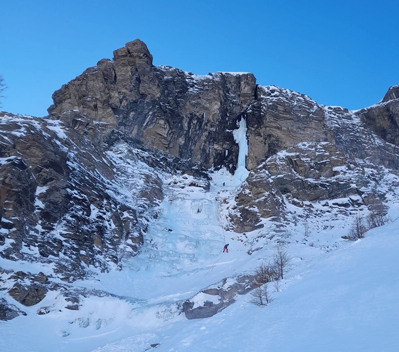 L3: portarsi alla base della colonna. Salire il piedistallo e poi la bella colonna fino al suo termine. 40 metri. Sosta su ghiaccio