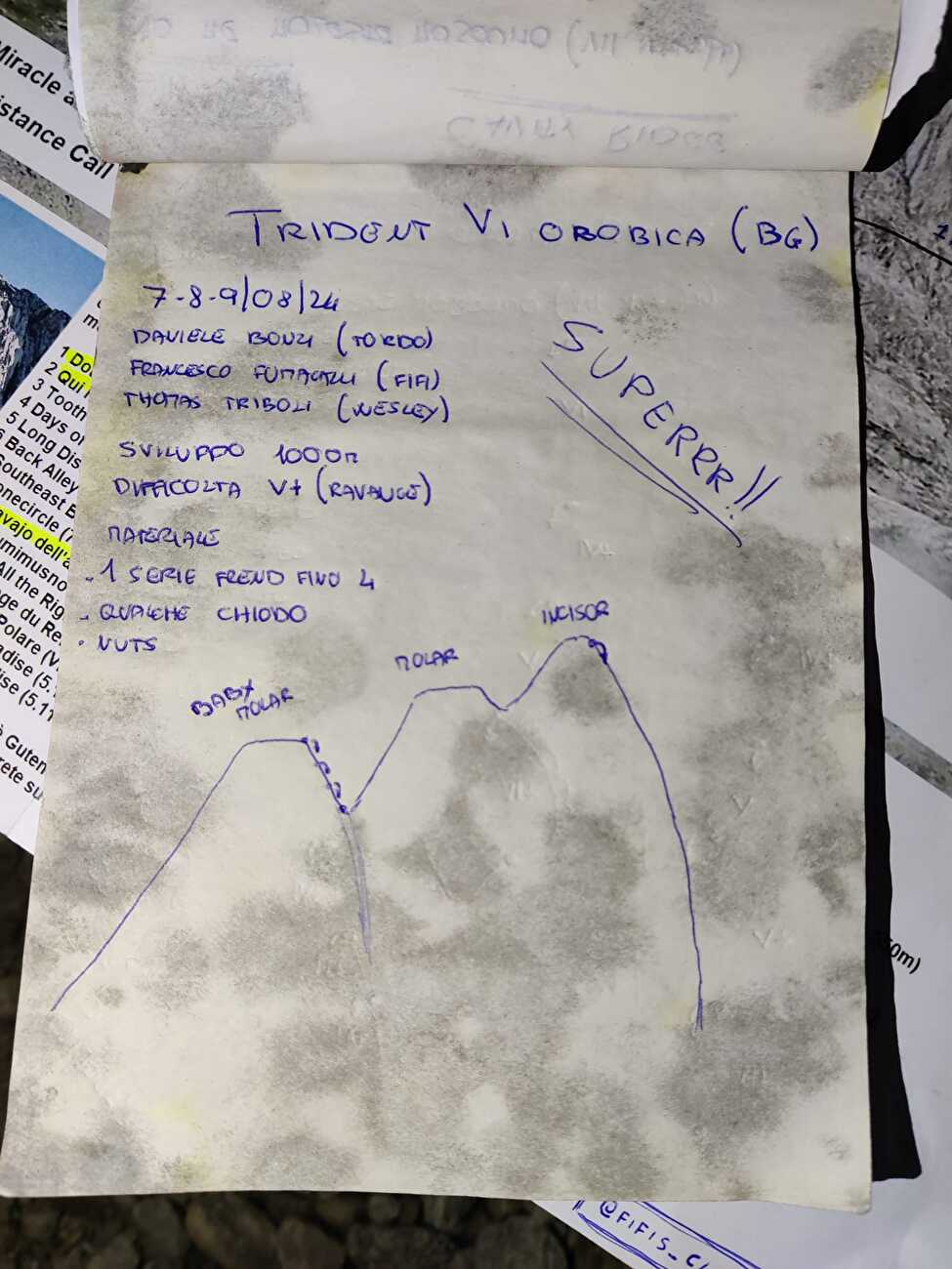 NoteLa via si chiama traversata Trident VI Orobica per l’analogia con il nome e in onore della comune delegazione CNSAS, dove si sono conosciuti gli alpinisti.