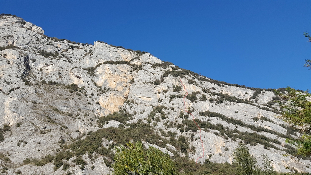 Dal parcheggio, si continua lungo la strada che diventa sterrata e attraversa dei frutteti. Alla fine degli stessi inizia il bosco e si vede sulla sinistra il fiume. Continuare per 100 metri, poco prima di una strada con sbarra che sulla sinistra scende al fiume, si noterà una traccia sulla destra che sale ripida nel bosco (ometto e bollo rosso). Seguire questo sentierino con bolli rossi che presto attraversa a sinistra passando sotto una falesia spittata. Continuare in salita a sinistra della falesia (bolli rossi), in 2 minuti si sarà all’attacco (siepe di legno e nome alla base). 20 minuti. Itinerario