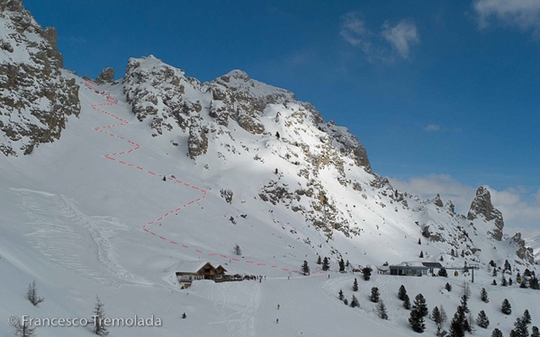 Si scende verso il centro della valle lungo un pendio aperto, con un primo tratto un po’ ripido (pericoloso con neve non assestata). Si segue poi la valle verso sinistra superando un tratto poco inclinato ed un successivo pendio molto bello che porta fino all’inizio della vegetazione (molte linee di discesa possibili). In basso conviene tenersi sul lato sinistro per immettersi nel sentiero estivo lungo il quale si percorre l’ultimo ripido ed obbligato tratto nel bosco per raggiungere la Vallunga. Qui si imbocca la pista di fondo che si segue verso sinistra fino a raggiungere la seggiovia alla fine della valle. Con quest’ultima ci si ricollega agli impianti del Sellaronda. Materiale