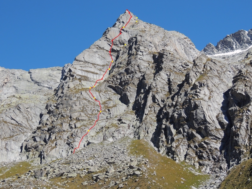 Salita di notevole sviluppo e interesse su una delle cime che si alza alla testata della Val Salarno. Su questa cima era stato salito solo lo spigolo ovest, estetico e ben visibile dal Rifugio, fu percorso nel lontano Agosto 1981 da Marco Farina, Paolo Paci, Paolo Servida & Emanuele Valle. Oggi questo percorso, divenuto classico grazie alla guida 'Le vie del cielo' che lo ha rivalutato, è spesso salito per il suo estetico spigolo Ovest, per la roccia ottima e soprattutto per il comodo avvicinamento. La via da noi aperta sale su roccia super, con arrampicata in prevalenza di placca e diedri, al centro della parete, trovando una logica via d'uscita alla cuspide finale formata da placche verticali.