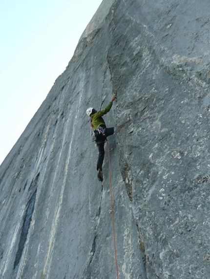Via molto difficile e tecnicamente impegnativa su placca, con un lungo diedro aperto di 70m che costituisce la parte chiave della via. Questo è composto di 10m difficili in placca (8a) sul secondo tiro, seguito dal difficile diedro di 70m...